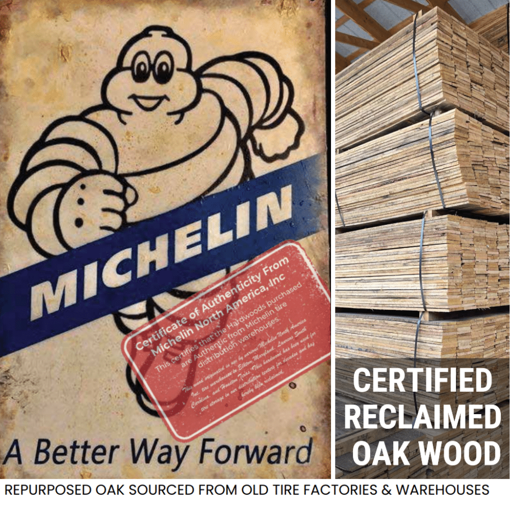 Add unmatched character, history, and eco-conscious value to your space with our Reclaimed Engineered Industrial Oak Flooring, salvaged directly from the legendary Michelin Tire North America warehouses in Elkton, Maryland, Laurens, South Carolina, and Houston, Texas.